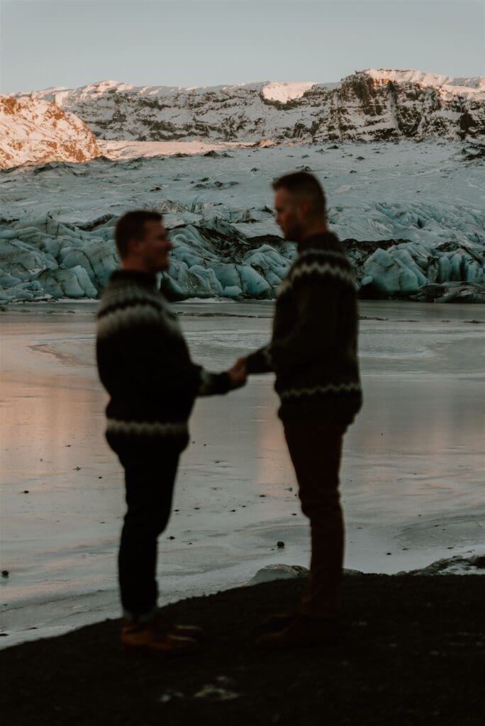 It is safe to explore near the glacier lagoons together, but a hike up onto a glacier or into an ice cave requires a local glacier guide and specialized equipment. Want help crafting an engagement or elopement session on a glacier? I got you!